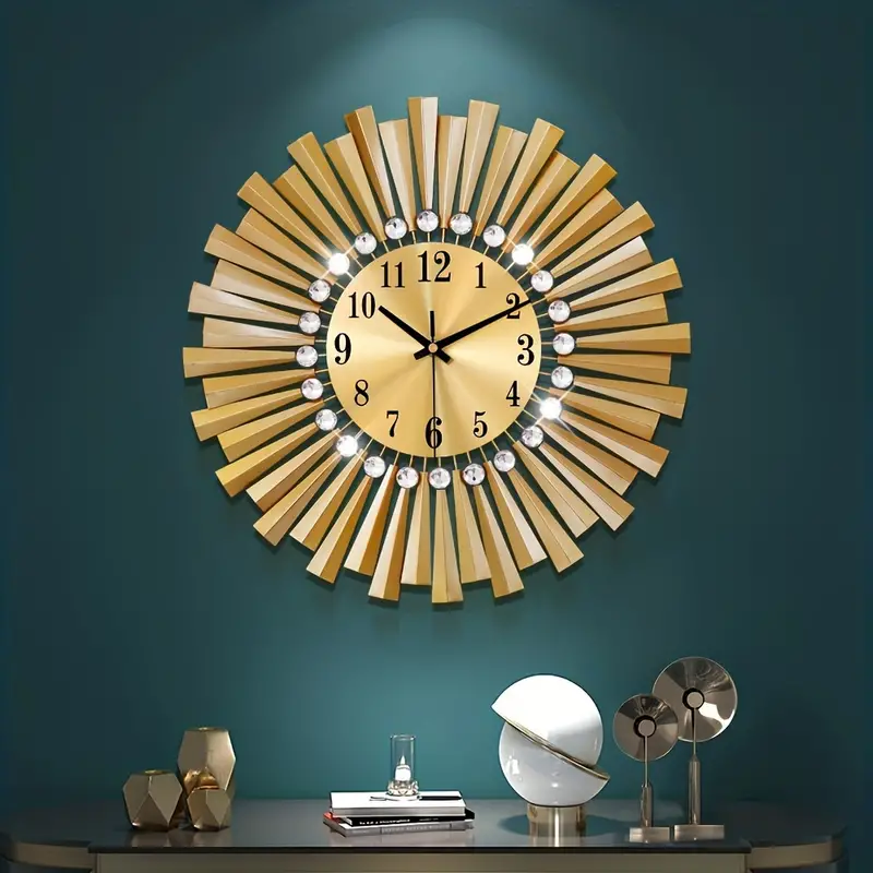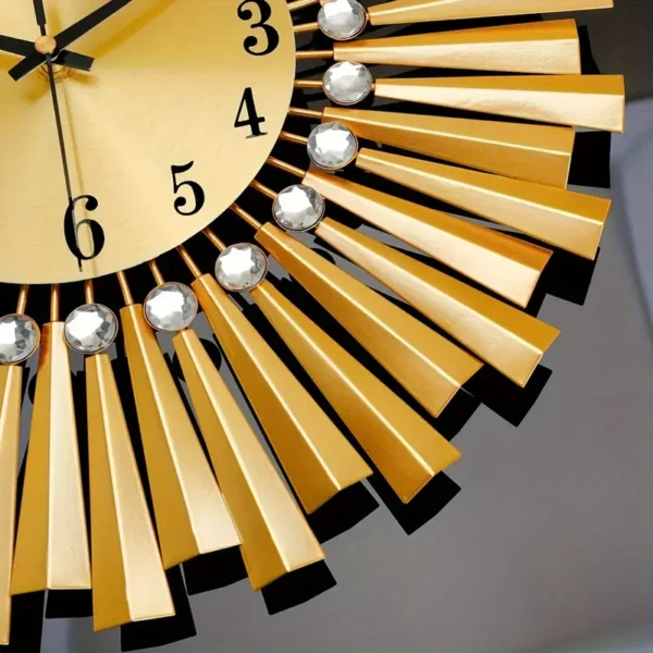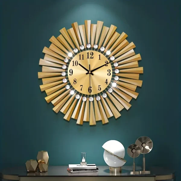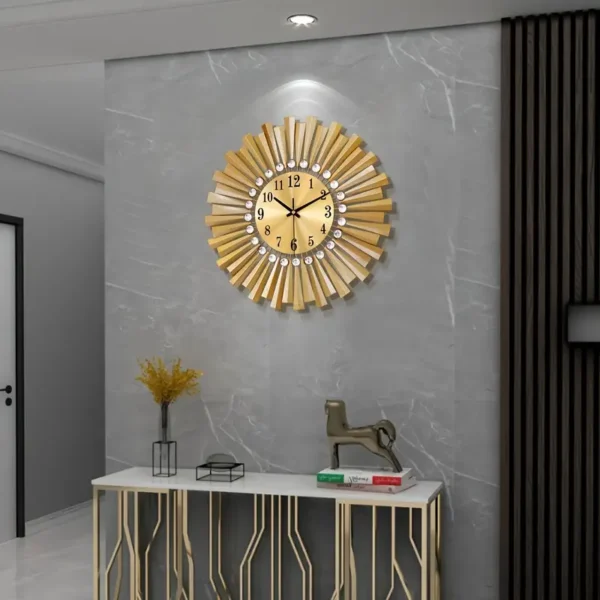 - Design: Eine auffällige Wanduhr, die mit goldfarbenen Strahlen und funkelnden Kristalleinlagen entworfen wurde, um die Illusion eines Sonnenstrahls zu schaffen.